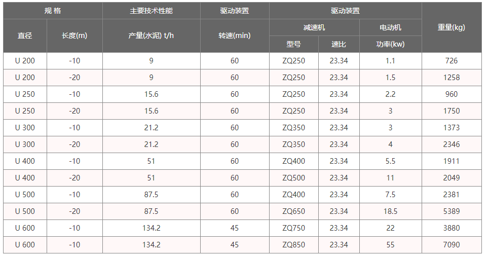 U型螺旋輸送機(jī)工作時,電機(jī)帶動旋轉(zhuǎn)的螺旋葉片將物料推移而進(jìn)行輸送,螺旋輸送機(jī)旋轉(zhuǎn)軸上焊的螺旋葉片,葉片的面型根據(jù)輸送物料的不同有實(shí)體面型、帶式面型、葉片面型等型式。使物料不與螺旋輸送機(jī)葉片一起旋轉(zhuǎn)的力是物料自身重量和螺旋輸送機(jī)機(jī)殼對物料的摩擦阻力。參數(shù)如下: