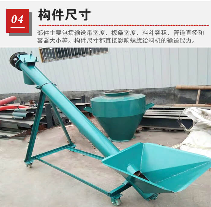 主要包括輸送帶寬度、板條寬度、料斗容積、管道直徑和容器大小等。這些構(gòu)件尺寸都直接影響螺旋給料機的輸送能力。如螺旋輸送機管徑越大,效率也就越高。當(dāng)然,并不一定就是輸送機本身才能影響效率,物料的各種性質(zhì)也都會對效率有所影響。