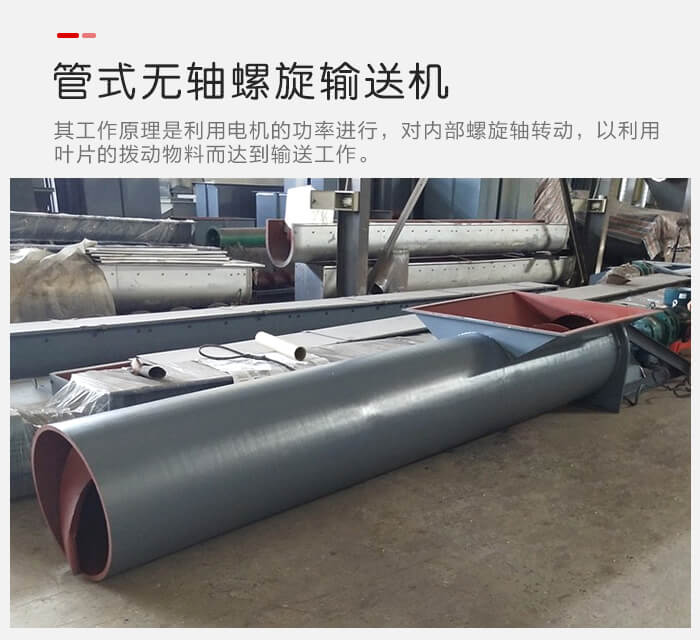 管式無(wú)軸螺旋輸送機(jī)其,工作原理與管式有軸螺旋輸送機(jī)的工作原理大致相同,其都是利用電機(jī)的功率進(jìn)行工作的實(shí)現(xiàn),然而它們之間的不同就是其,有/無(wú)螺旋軸的區(qū)別