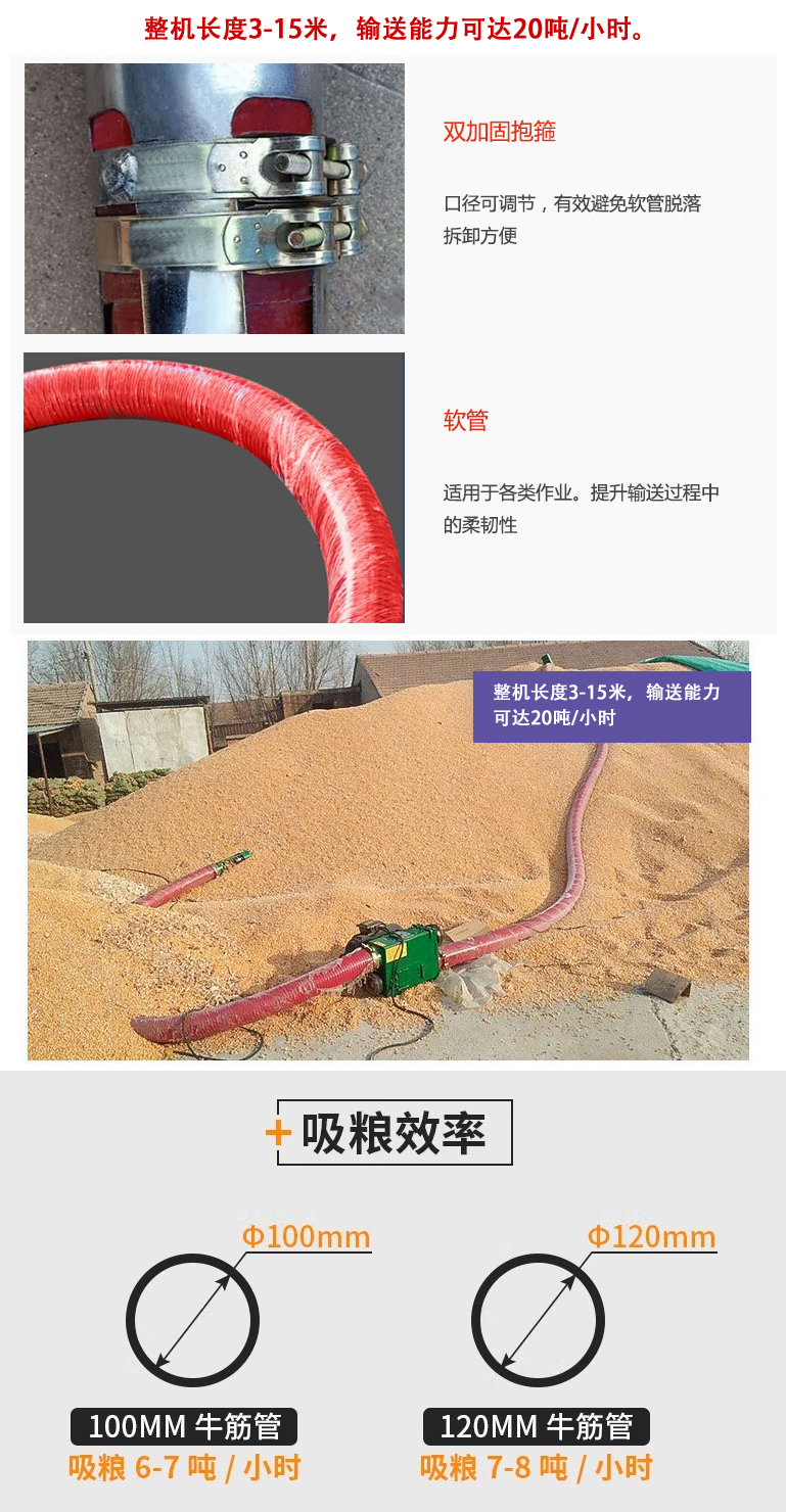 適用物料:可輸送小麥、大豆、玉米、稻谷、高梁、塑料、樹脂、大米等顆粒。