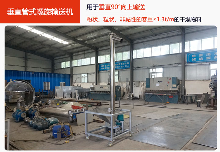 垂直管式螺旋輸送機適合垂直90°向上輸送物料,能輸送粉狀、粒狀、非黏性的容重≤1.3t/m的干燥物料。垂直管式螺旋輸送機的輸送過程依靠的是物料與機殼之間的摩擦力進行物料的輸送,進料口到出料口之間的距離從2.5米起到15米止,0.5米為一檔,用戶可根據需要選用,大漢垂直管式螺旋輸送機材質分為兩種:碳鋼與不銹鋼,碳鋼的比較適用于一般的物料的提升,不銹鋼材質的主要用于食品行業與化工行業的使用。