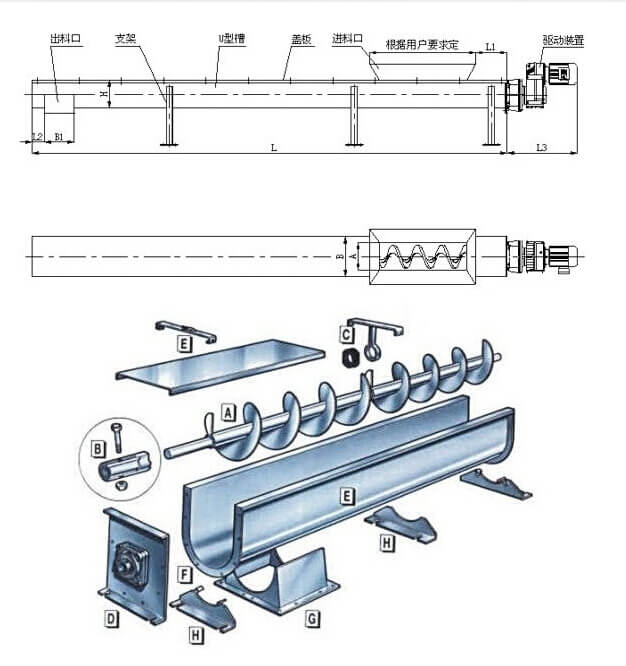 (1)U型槽式螺旋輸送機長度小于35m時,為單軸驅(qū)動螺旋。